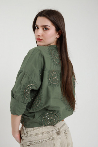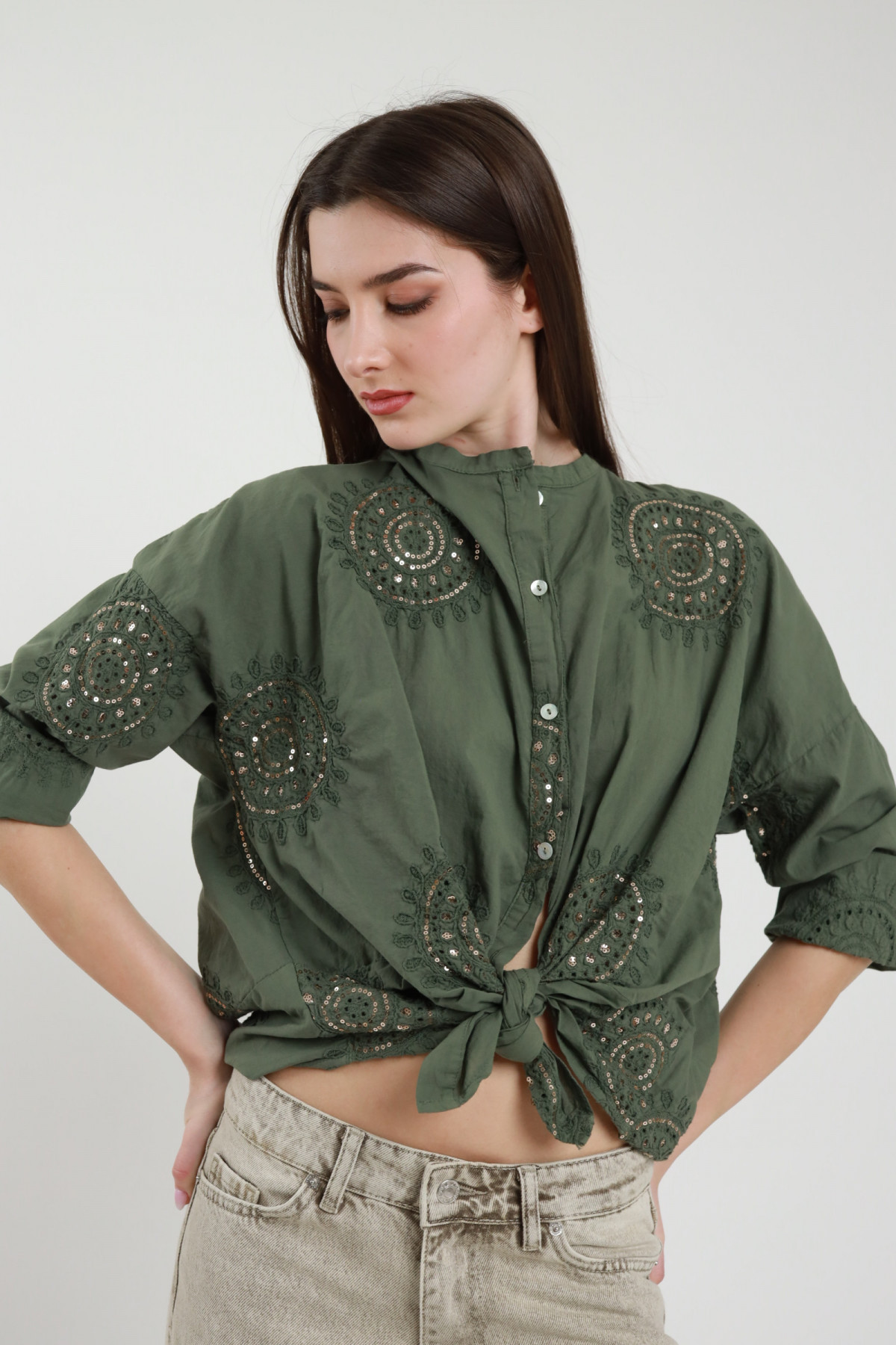 Camicia Collo alla Coreana Ricamata con Nodo Rimovibile.