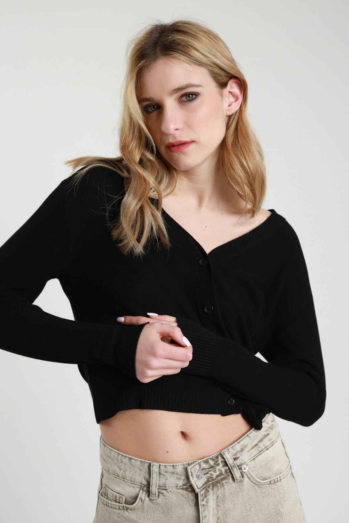 Gerippter Lurex-Cardigan mit Knopfverschluss. 90 %vi 8 %fm 2 %ea