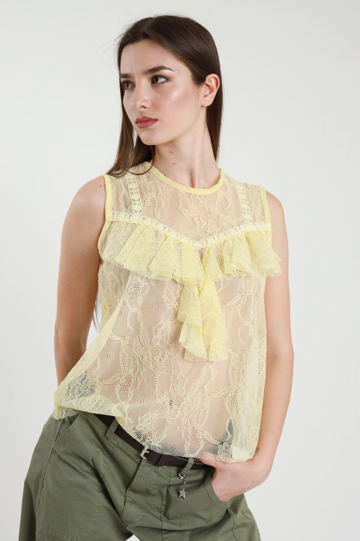 Top Smanicato in Cotone Elasticizzato con Scollo a V con Gale Ricamate.