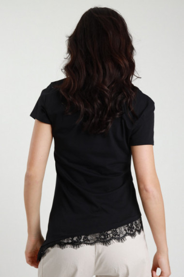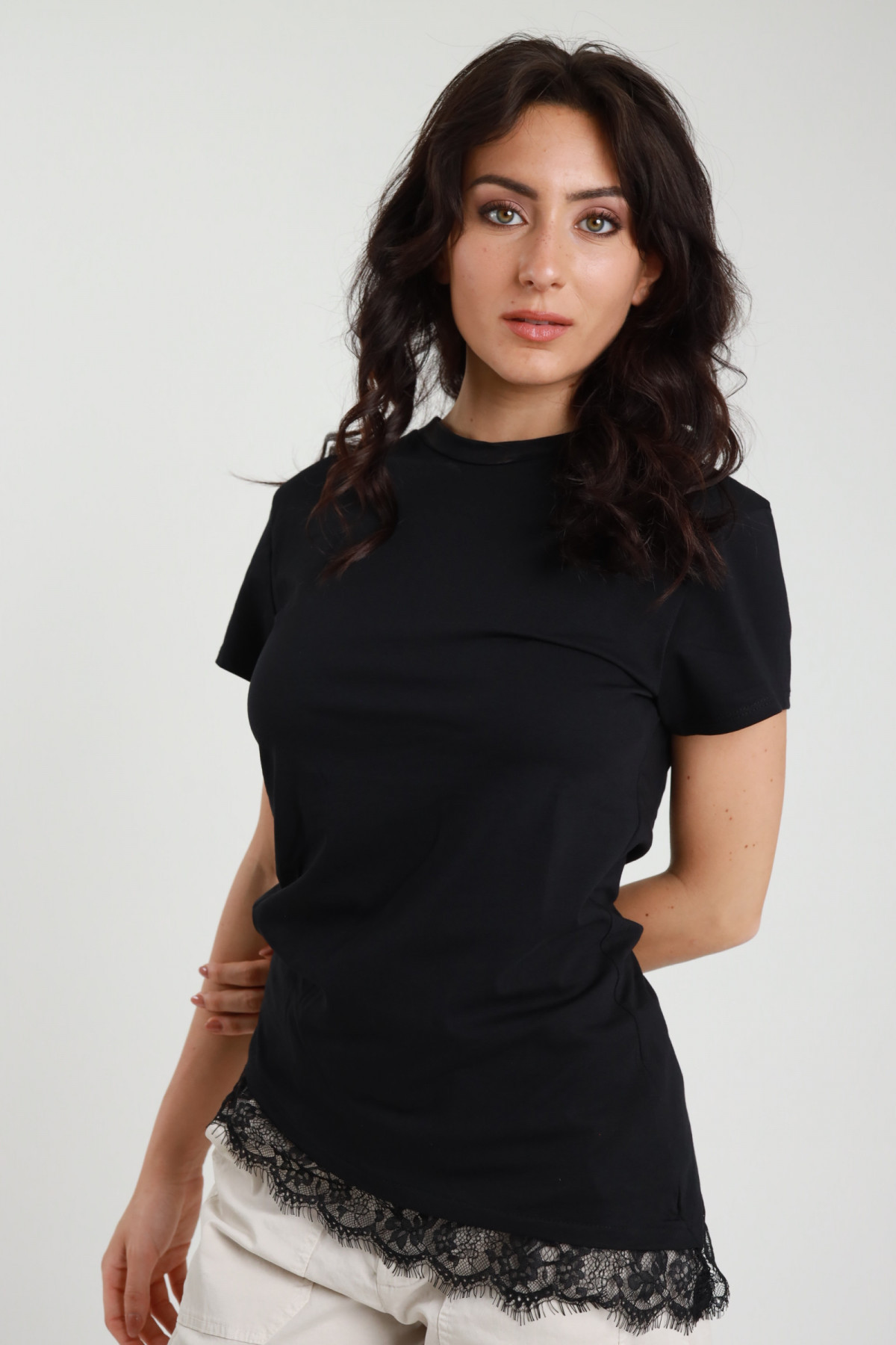 T-Shirt in Cotone Elasticizzato con Ripresa Laterale e Pizzo sul Fondo.