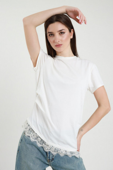 T-Shirt in Cotone Elasticizzato con Ripresa Laterale e Pizzo sul Fondo.