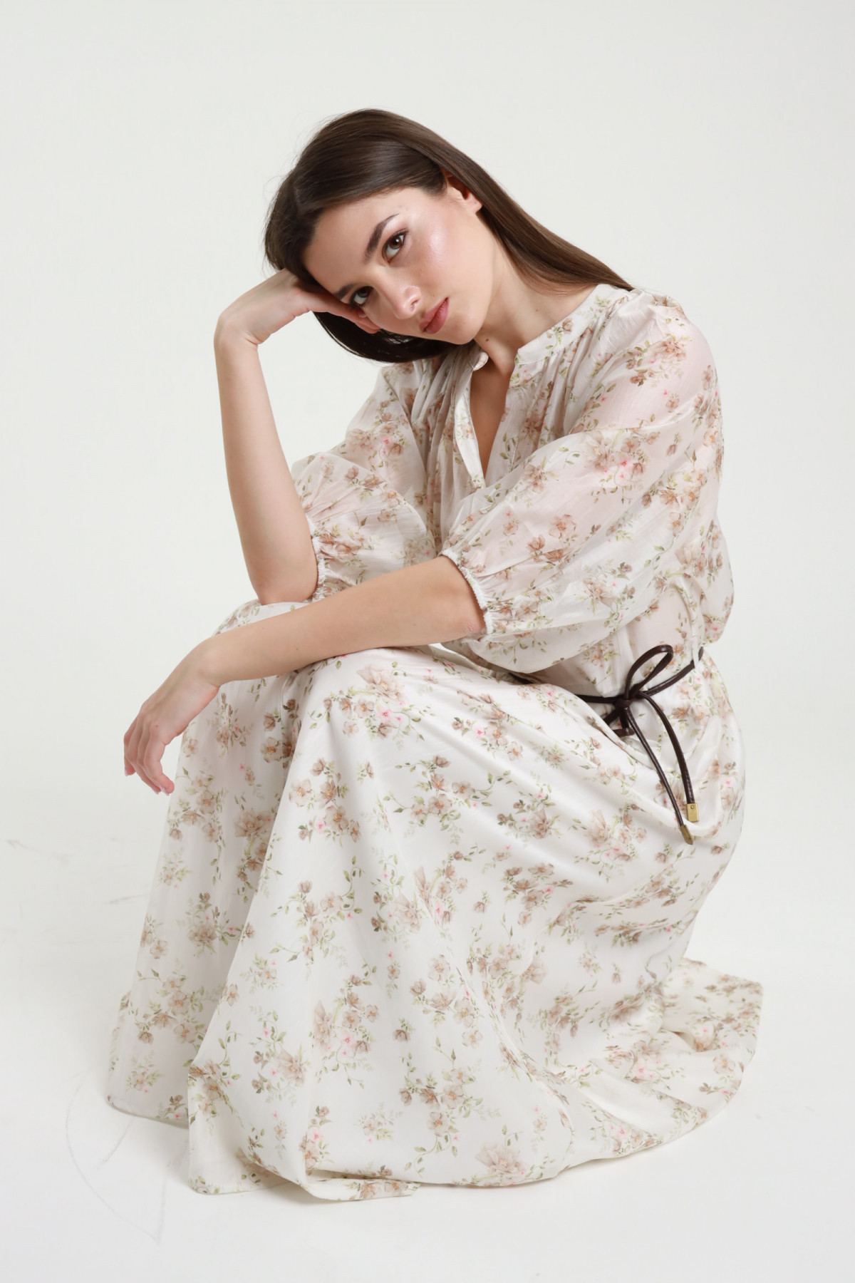 Abito Chemisier Lungo in Fantasia Floreale, con Cintura in Vita.