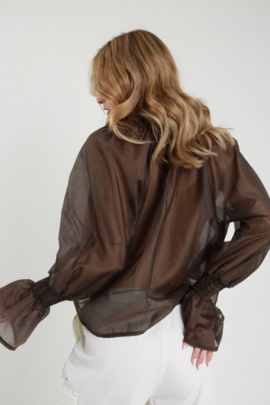 Blusa Semitrasparente Crop con Pizzo sul Fondo, Maniche a Palloncino con Elastico sui Polsi, Scollo a V.