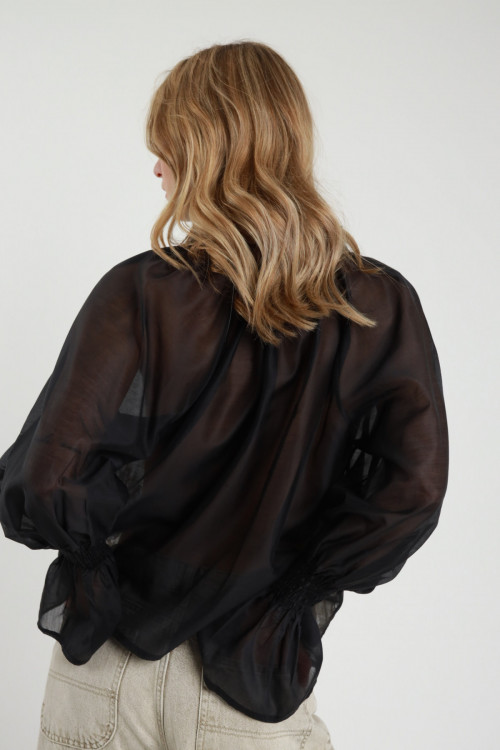 Blusa Semitrasparente Crop con Pizzo sul Fondo, Maniche a Palloncino con Elastico sui Polsi, Scollo a V.