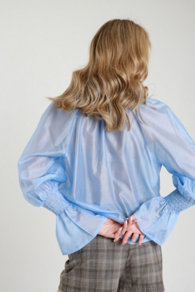 Blusa Semitrasparente Crop con Pizzo sul Fondo, Maniche a Palloncino con Elastico sui Polsi, Scollo a V.