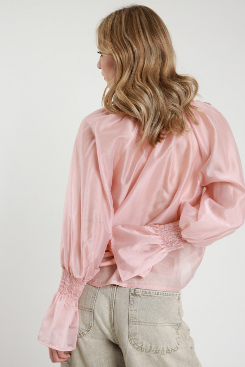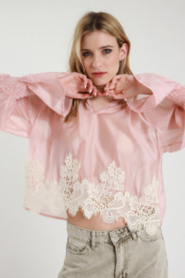 Blusa Semitrasparente Crop con Pizzo sul Fondo, Maniche a Palloncino con Elastico sui Polsi, Scollo a V.