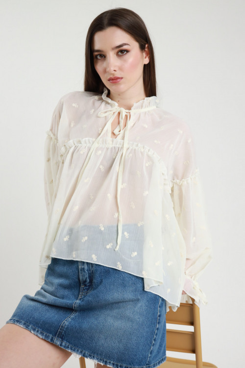 Blusa Over con Ricami, Elastico sui Polsini e Fiocco sul Collo.
