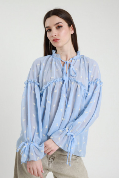 Embroidered half-sleeved blouse with ruffles and lace on the neckline, elastic under the bust and puffed sleeves. 49%ly 30%pl 21%pa
