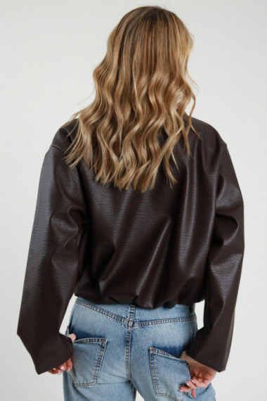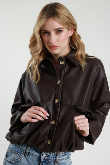 Bomber in Ecopelle con Colletto Camicia, Tasche Laterali con Pattina.
