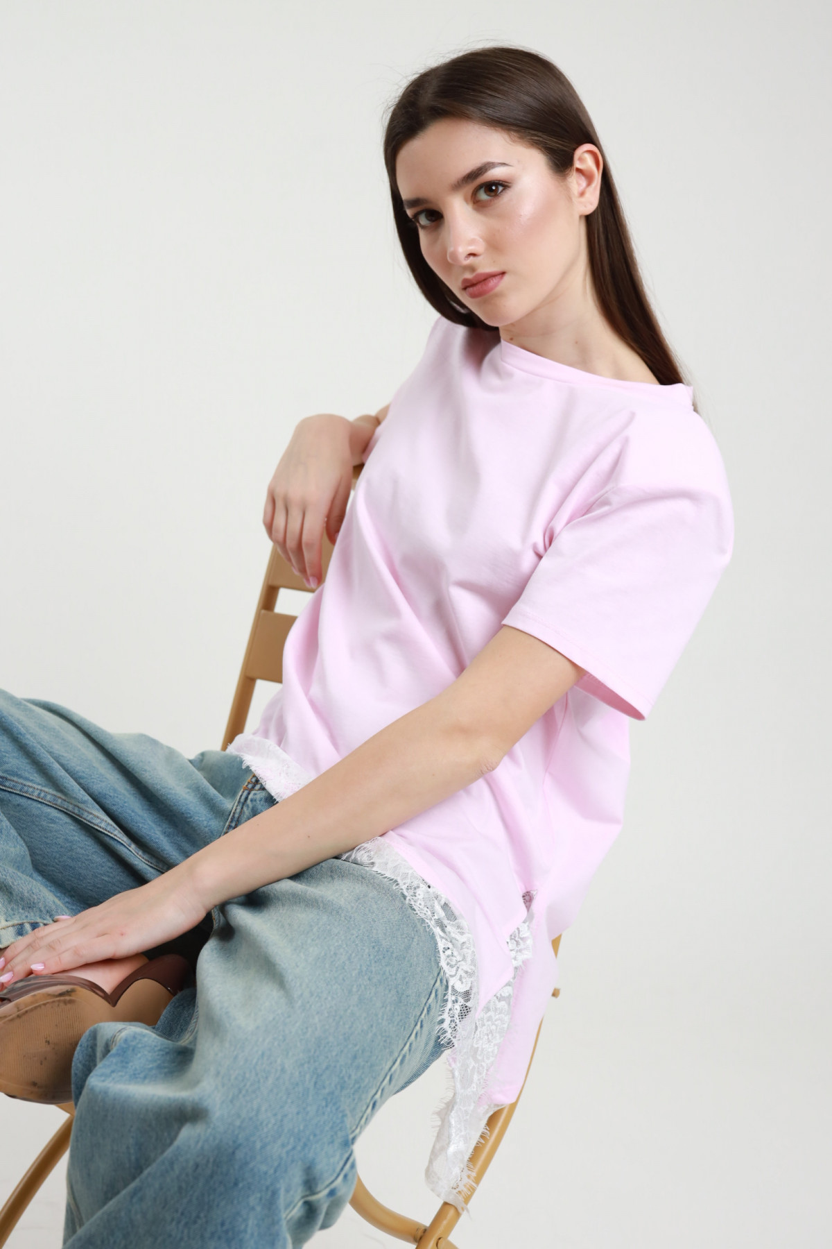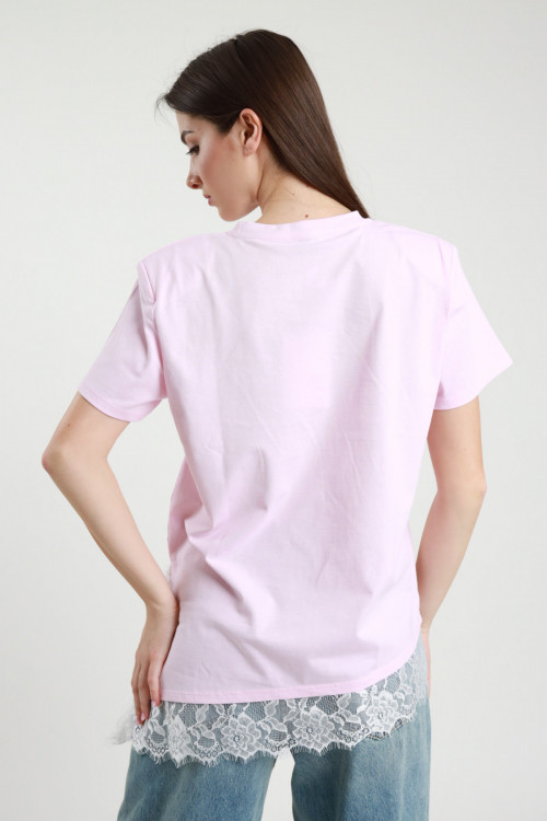 T-Shirt in Cotone Elasticizzato con Ripresa Laterale e Pizzo sul Fondo.
