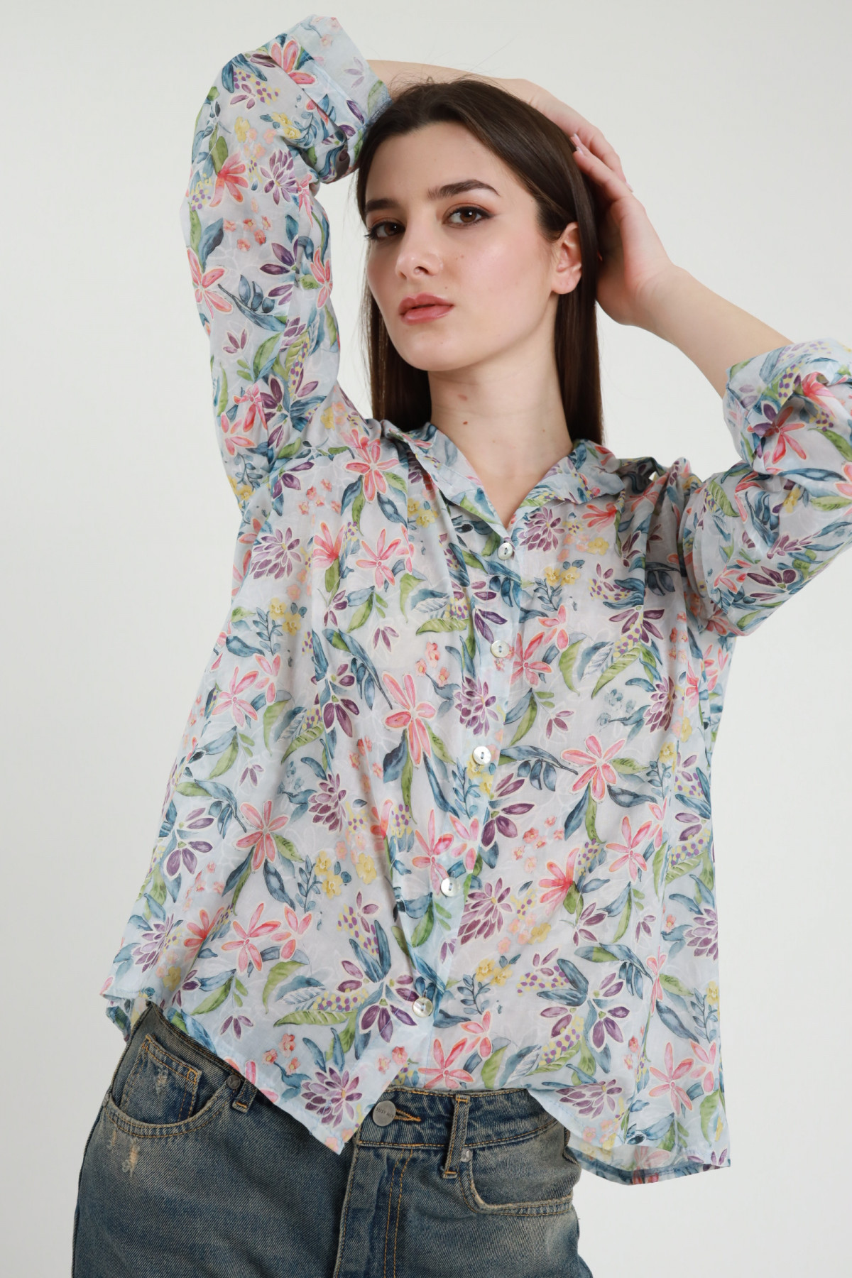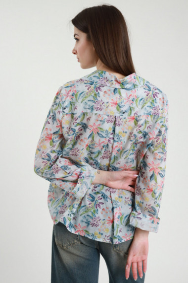 Semi-transparent Shirt in Flower Pattern with Mandarin Collar. 87%ly 13%pa