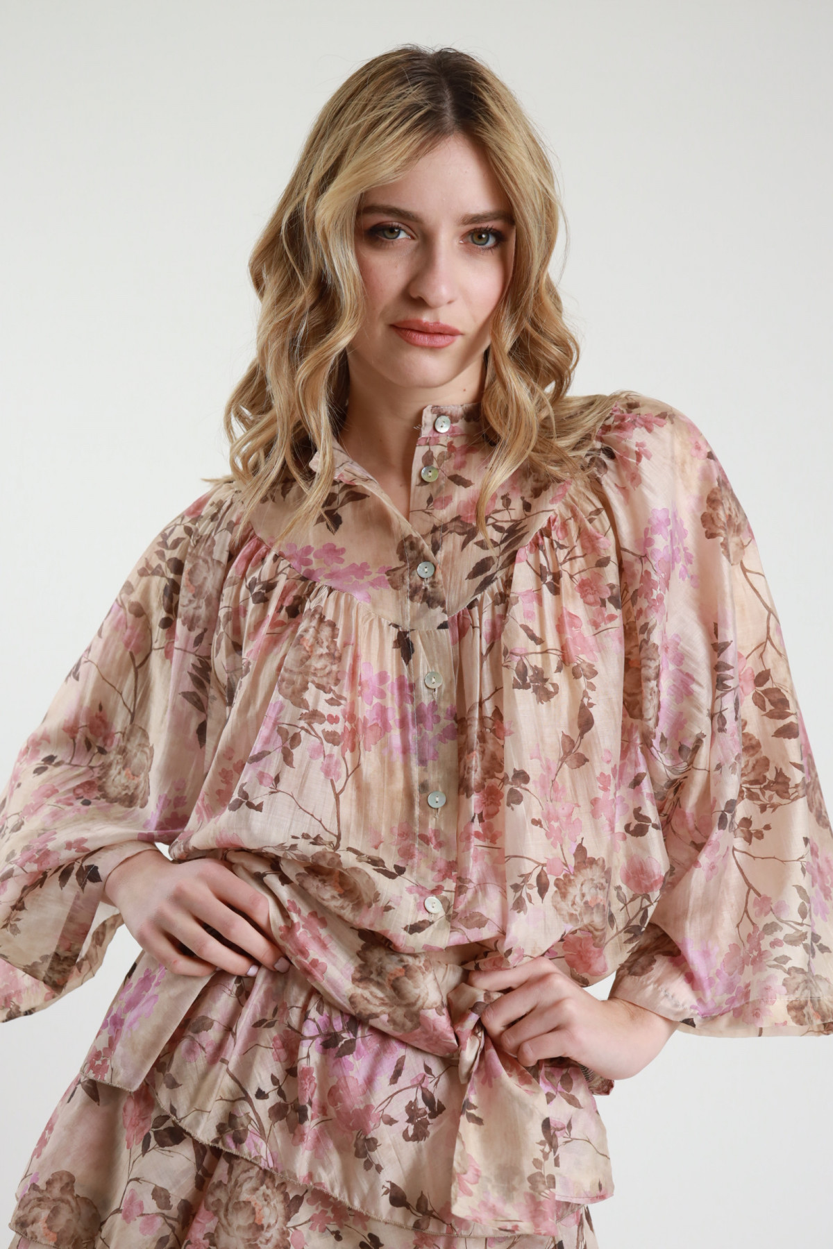 Camicia Collo Coreana, Maniche Ampie e Arriccio sul Fronte con Stampa Fiori.