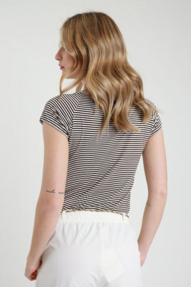 T-Shirt in Viscosa Elasticizzata con Scollo a Barca in Fantasia Rigata, Manica Raglan.