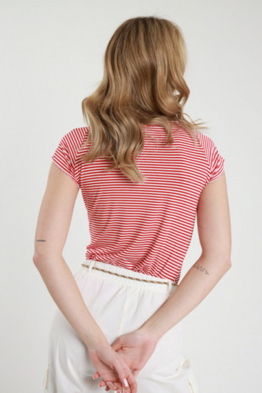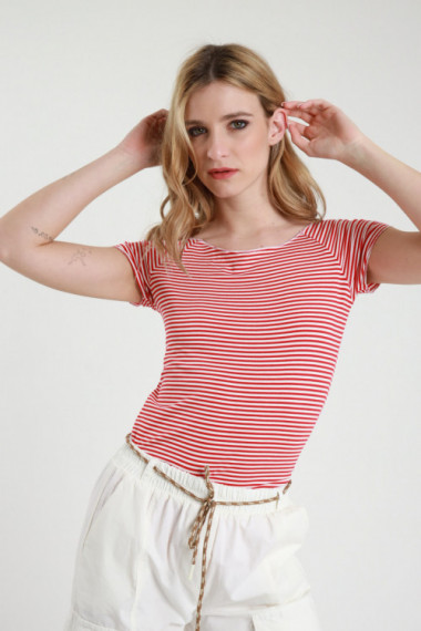 T-Shirt in Viscosa Elasticizzata con Scollo a Barca in Fantasia Rigata, Manica Raglan.