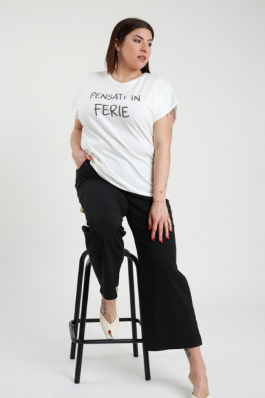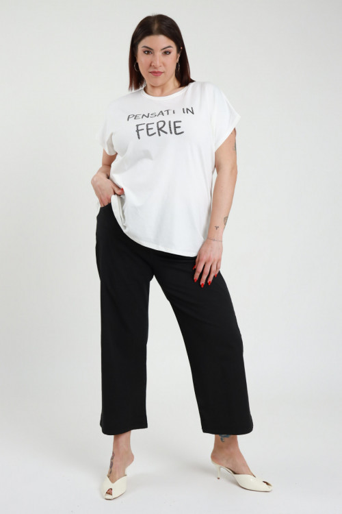 T-Shirt in Cotone Elasticizzato con Stampa Scritta "Pensati in Ferie" e Applicazione Strass - Linea Curvy Susy Star.
