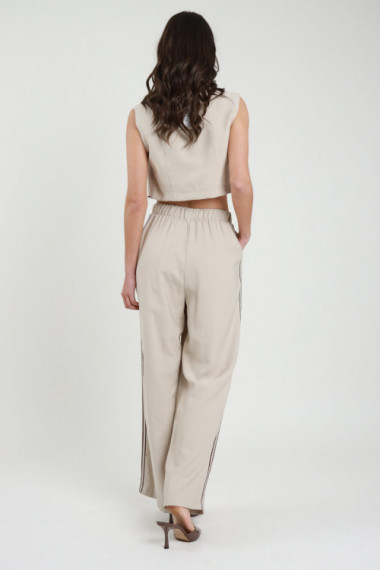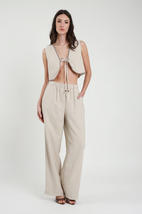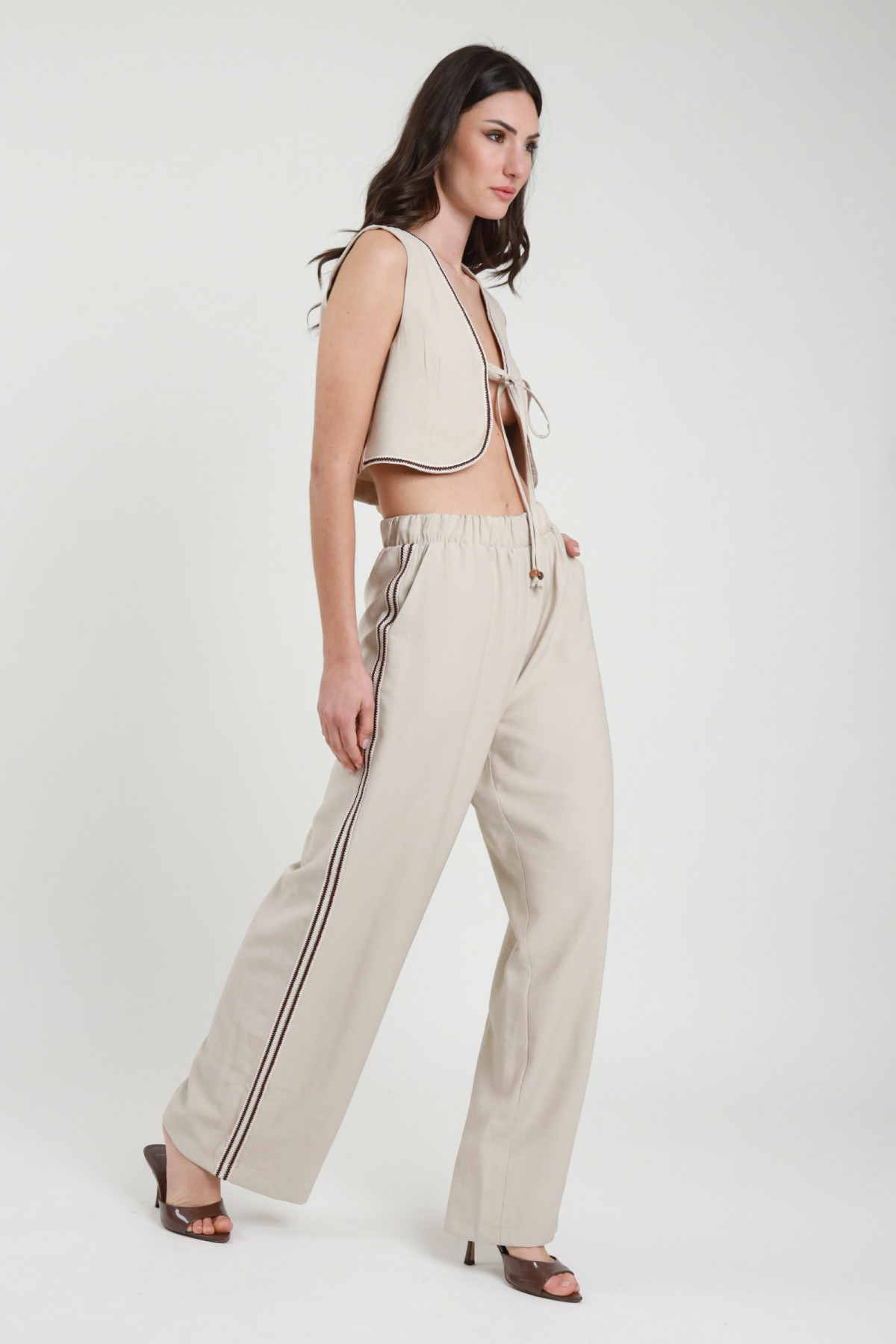 Pantalone a Palazzo in Viscosa Elasticizzata con Bande Laterali in Passamaneria, Coulisse Regolabile in Vita.