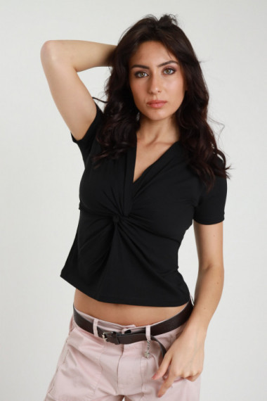 Top Corto in Viscosa Elasticizzata, Mezze Maniche, con Nodo sullo Scollo.