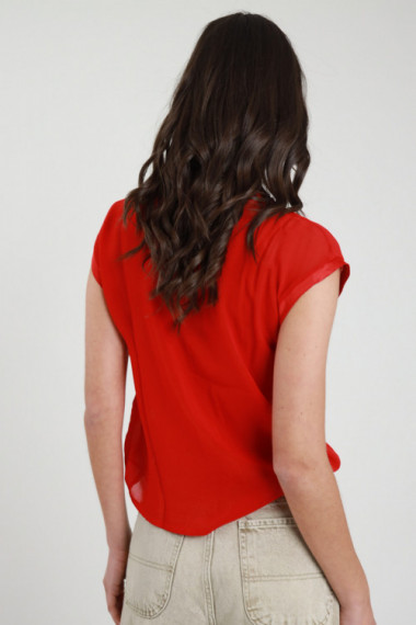 Bluse mit V-Ausschnitt, Rottönen und Spitze vorne, Puffärmel mit Gummizug an den Manschetten. 85 % 15 % pl