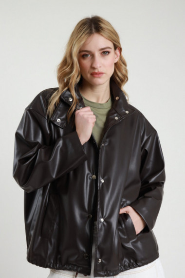 Bomber in Ecopelle con Colletto Camicia, Tasche Laterali con Pattina.