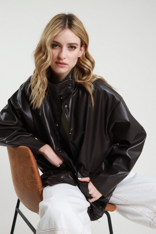 Bomber Over in Ecopelle, Chiusura Colletto Laterale con Bottone, Coulisse sul Fondo e Tasche Laterali.