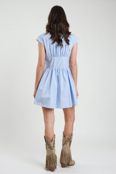 Mini Abito Smanicato in Cotone, Scollo a V con Bottoni, Sfiancato con Ripresa in Vita e Gonna Leggermente a Palloncino.