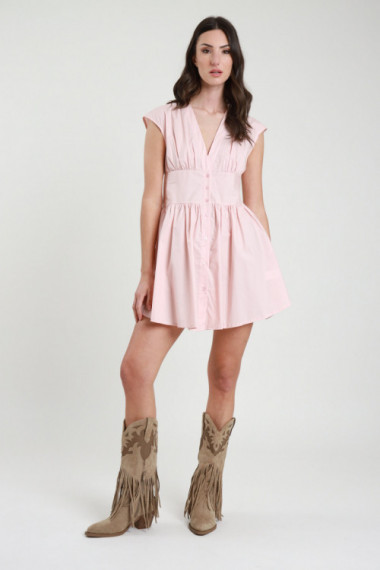 Mini Abito Smanicato in Cotone, Scollo a V con Bottoni, Sfiancato con Ripresa in Vita e Gonna Leggermente a Palloncino.