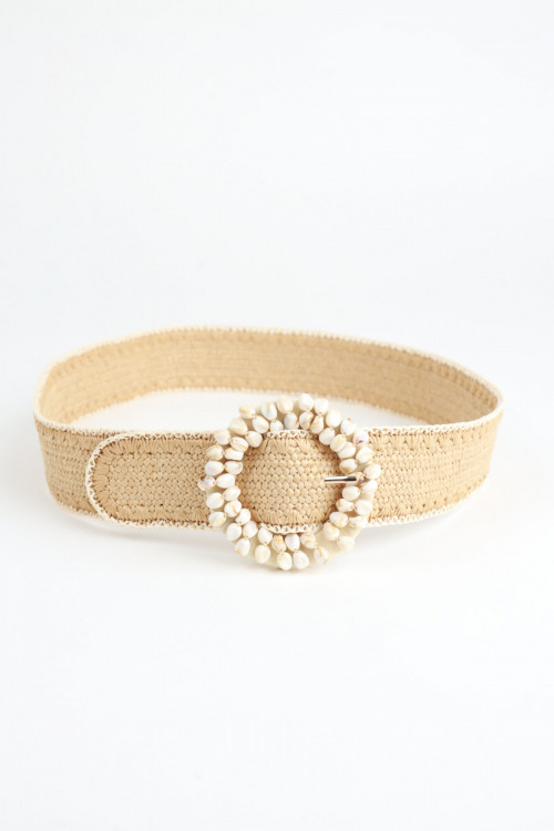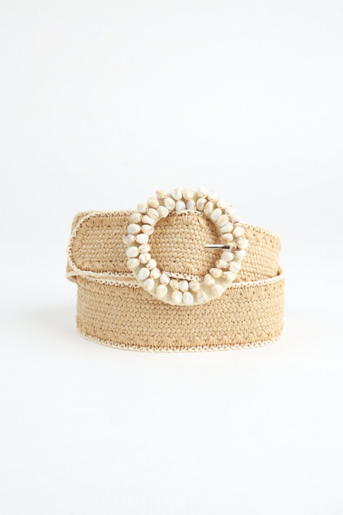 Cintura in Raffia Elasticizzata con Fibbia Rotonda con Applicazione Conchiglie.