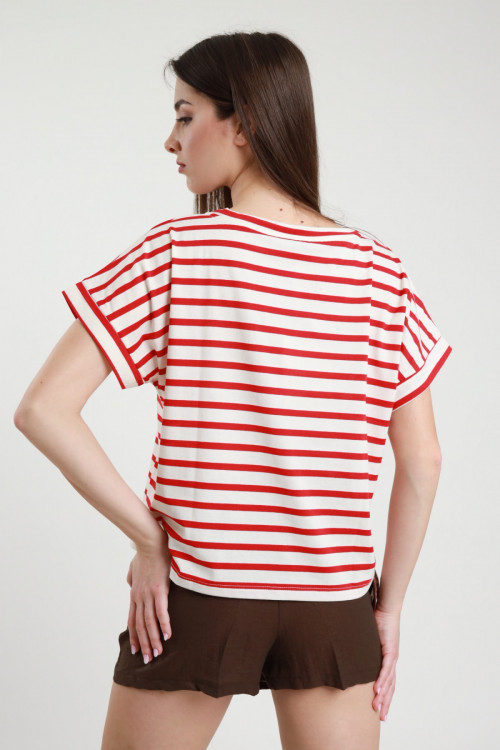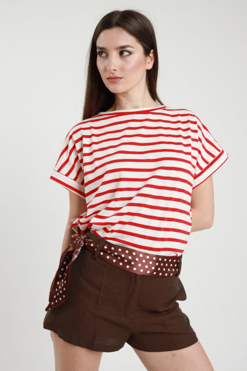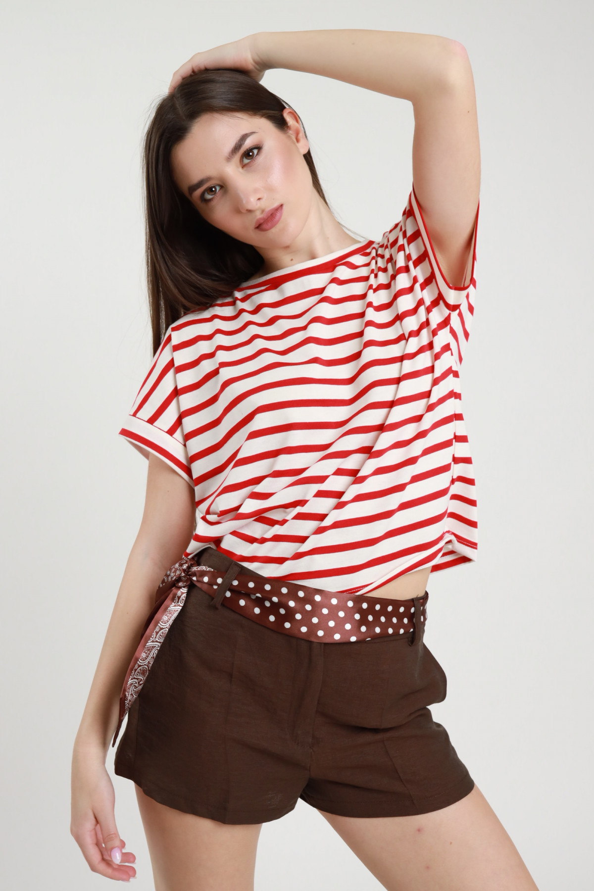 T-Shirt Elasticizzata Girocollo Mezze Maniche in Fantasia a Righe.