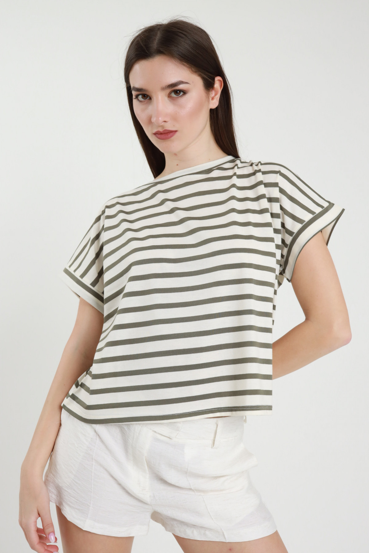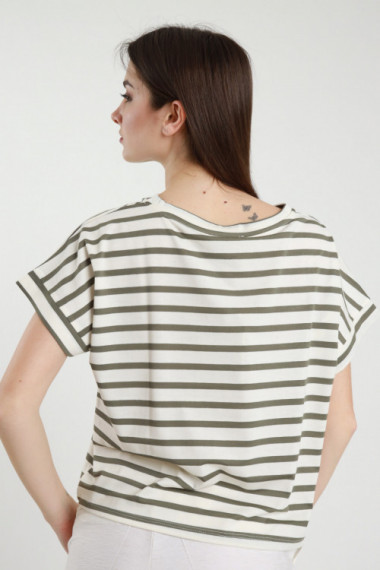 T-Shirt Elasticizzata Girocollo Mezze Maniche in Fantasia a Righe.