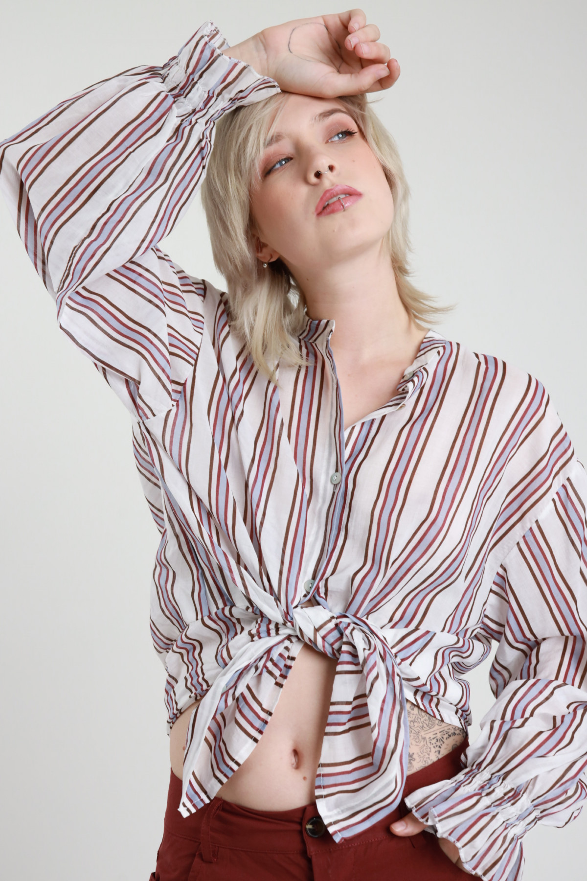 Camicia Gessata in Cotone con Maniche a Sbuffo con Elastico sui Polsi, Nodo Rimovibile e Colletto alla Coreana.