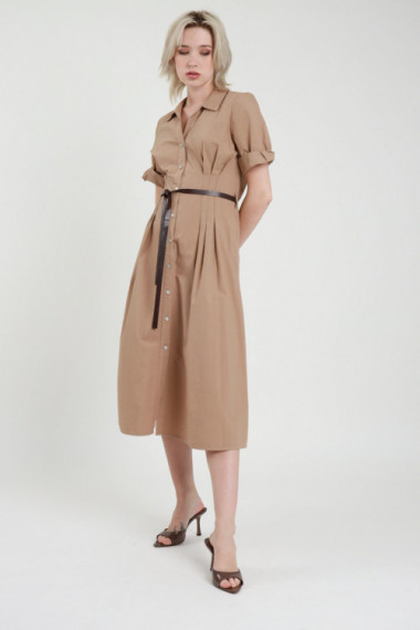 Abito Midi in Cotone con Mezze Maniche, Chiusura Bottoni Frontale con Colletto, Ripresa in Vita con Elastico e Sotto il Seno, Cintura in Ecopelle.