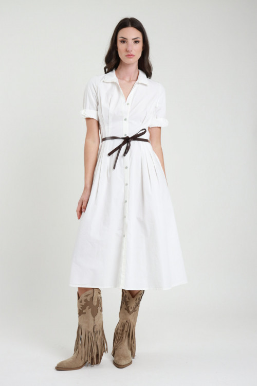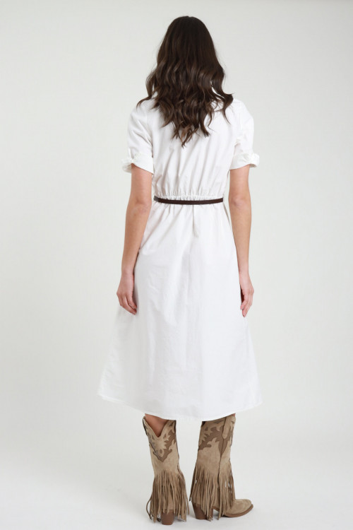 Abito Midi in Cotone con Mezze Maniche, Chiusura Bottoni Frontale con Colletto, Ripresa in Vita con Elastico e Sotto il Seno, Cintura in Ecopelle.