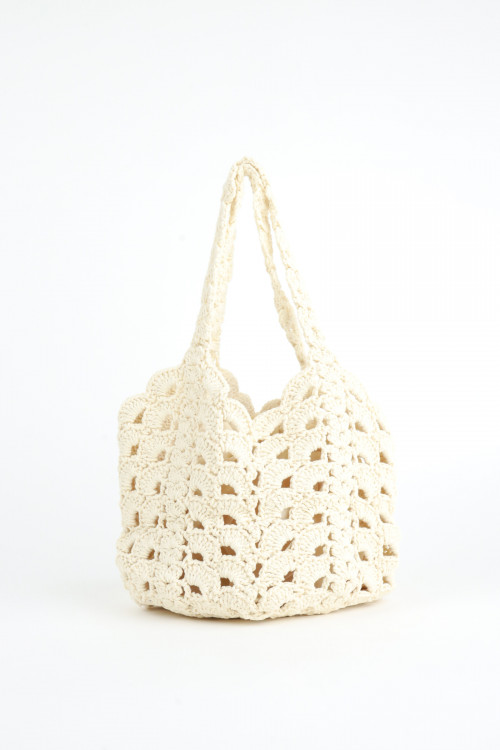 Shopper con Fronte in Crochet, Frange e Manici Corti in Fantasia Quadri.