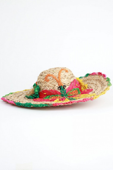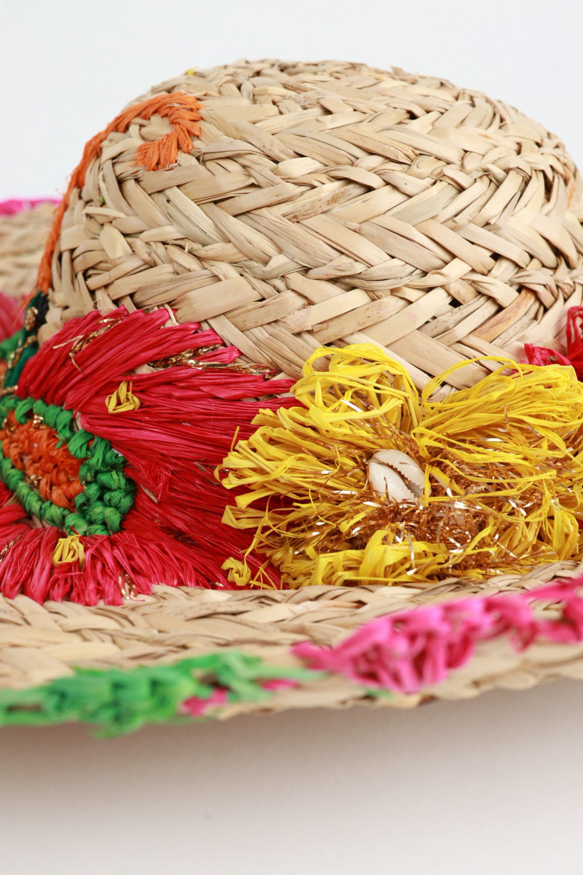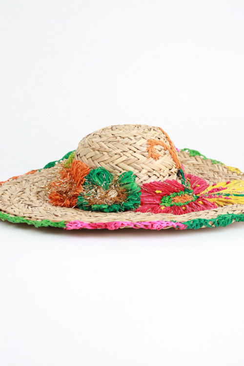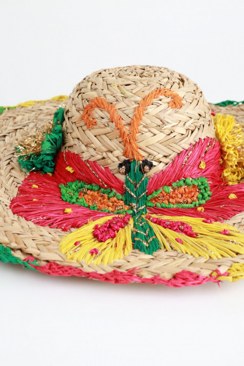 Cappello in Paglia a Tesa Larga con Dettaglio Fiori e Farfalla Colorati.