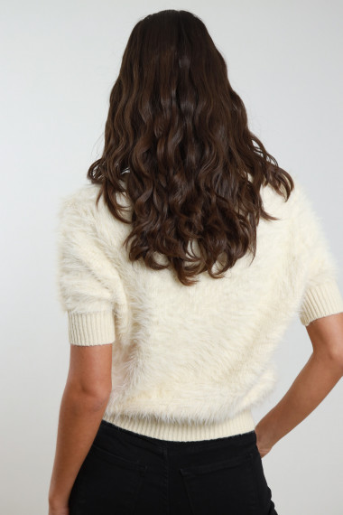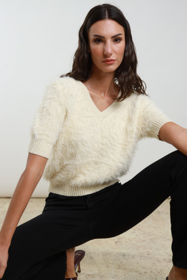 Kurzes Crew -Hemd mit hell geschnittenen Säumen unterschiedlicher Farbe. 52%VI 28%PL 20%PA