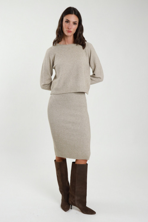 Rundhalspullover mit englischem Rippmuster. 50 % Stück, 30 % Stück, 10 % Stoff, 10 % Stoff