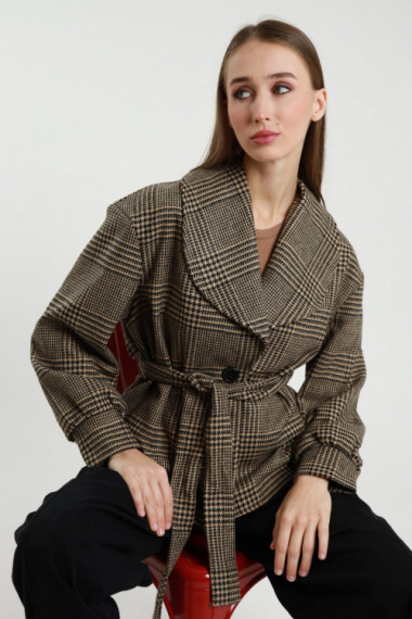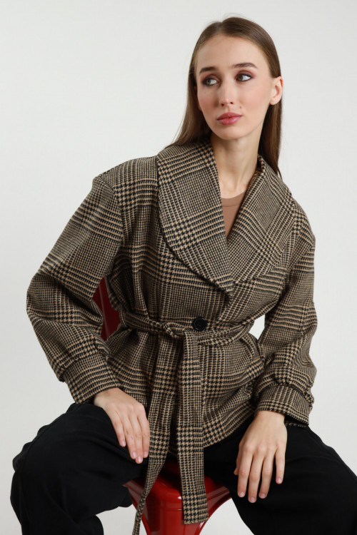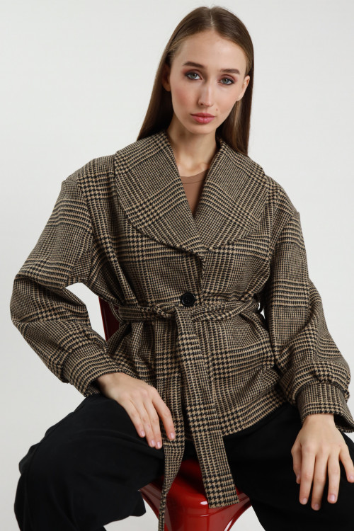 Giacca Over in Pied de Poule con Spalline e Cintura in Vita, Chiusura Bottoni.