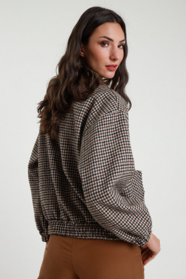 Bomber Smanicato a Quadri con Chiusura a Zip e Applicazione Spilla.