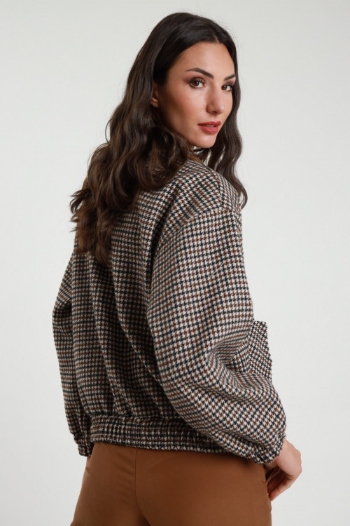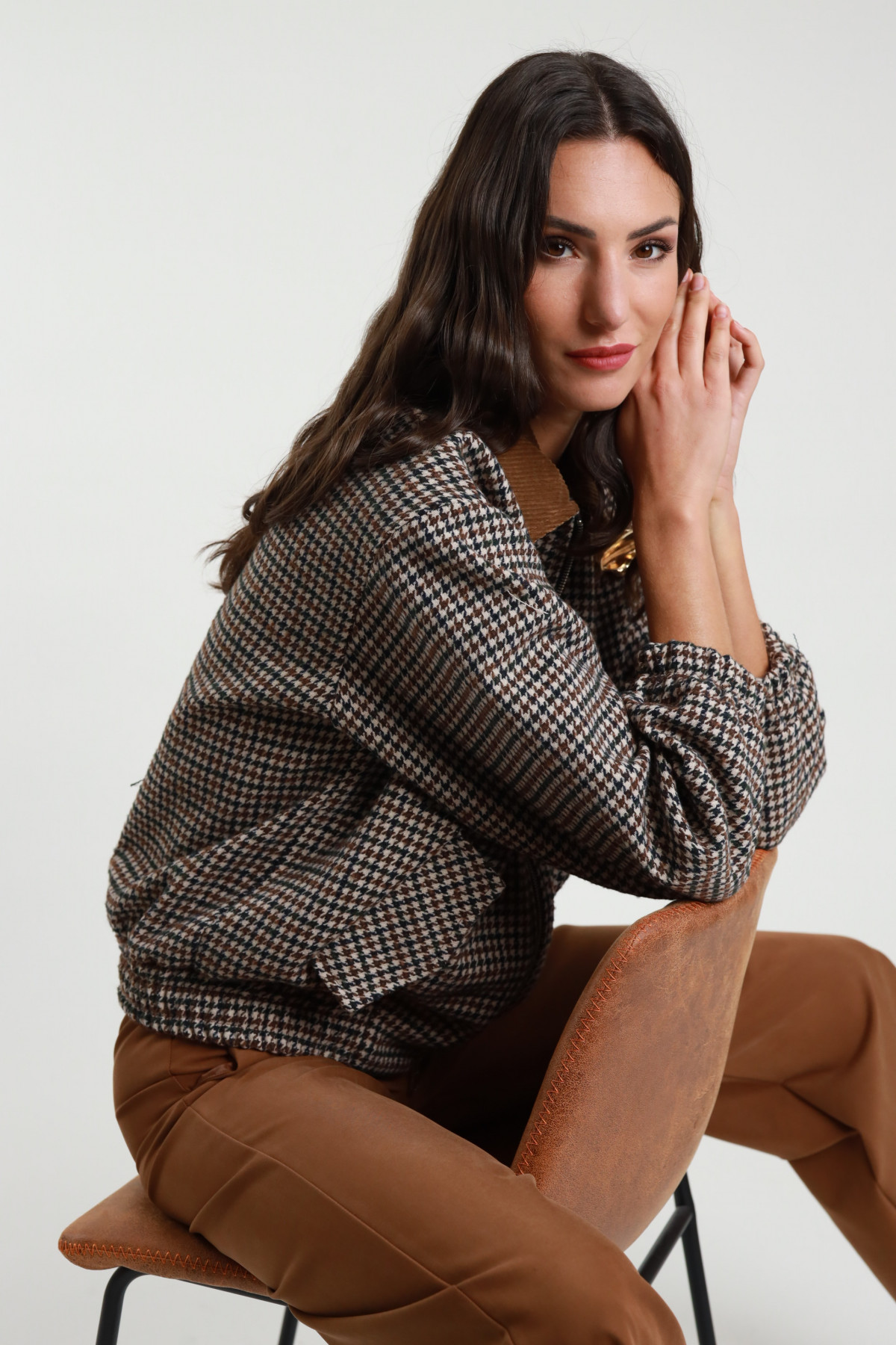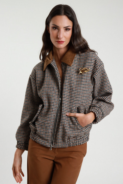 Bomber in Fantasia Pied De Poule con Collo in Velluto a Costine e Spilla Removibile. Chiusura a Zip e Tasche Laterali.