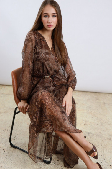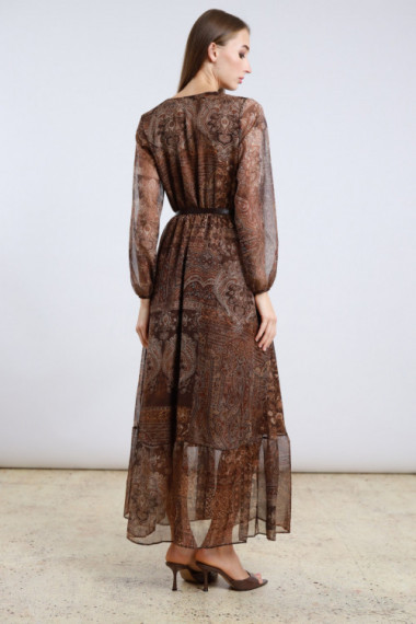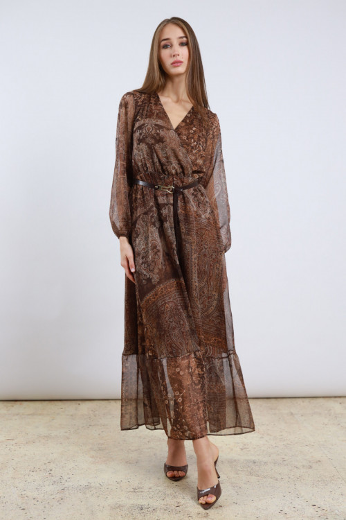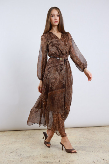 Abito Lungo in Fantasia Cashmere con Scollo a V, Elastico e Cintura in Vita, Maniche a Palloncino in Trasparenza.