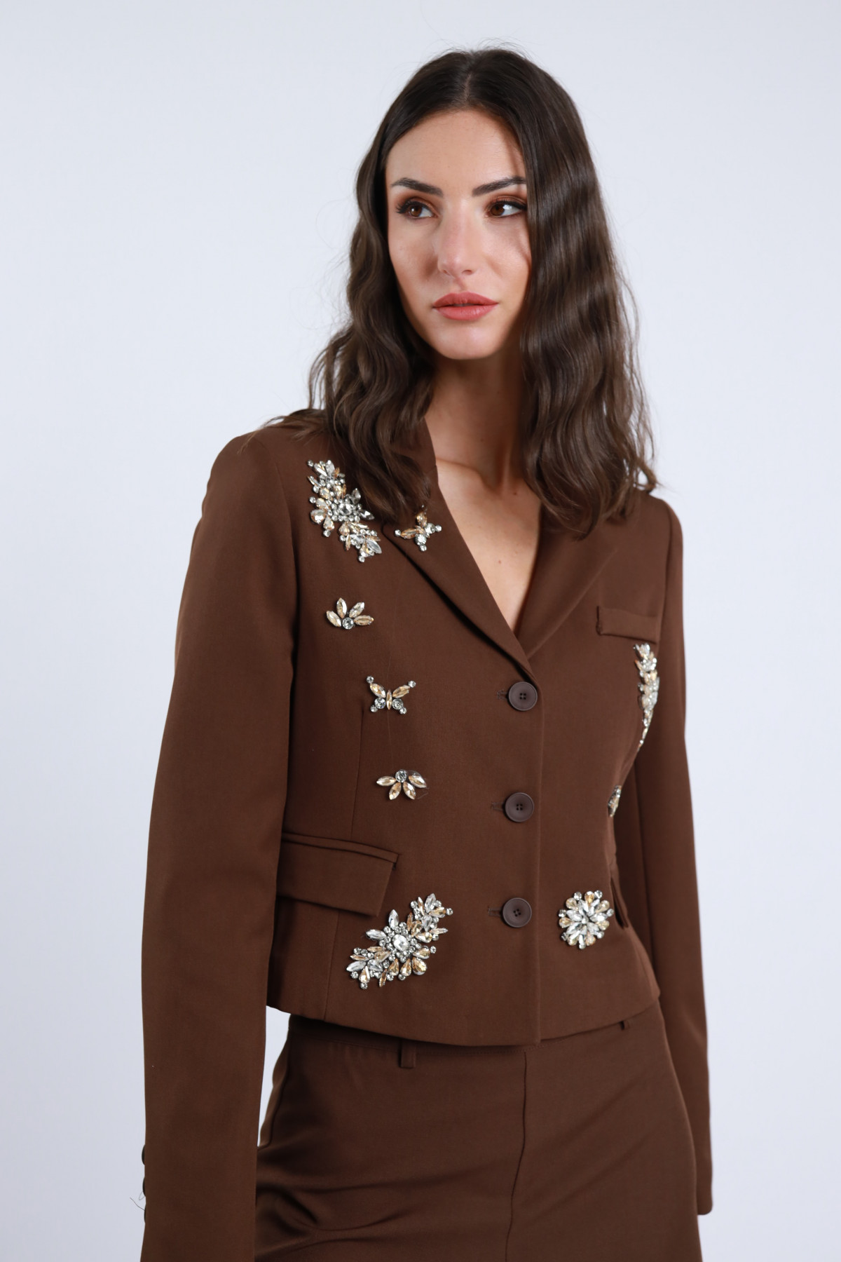 Blazer Monopetto Crop con Applicazioni Gioiello sul Fronte, Finte Tasche Filetto con Pattina.
