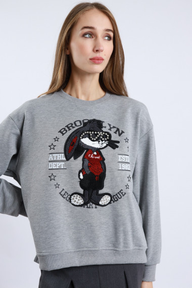 Felpa Girocollo con Applicazione Coniglio con Strass e Scritte.