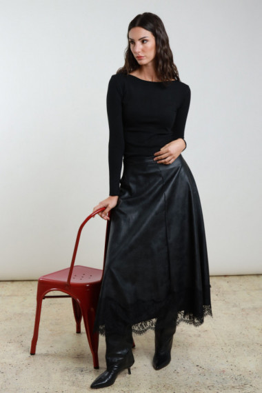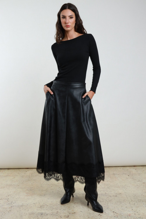 Gonna Lunga in Ecopelle a Ruota con Pizzo sul Fondo.