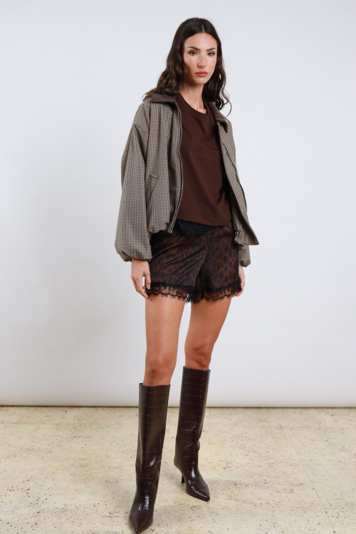 Shorts In Raso in Fantasia Animalier Maculata Con Pizzo Sul Fondo ed Elastico in Vita.