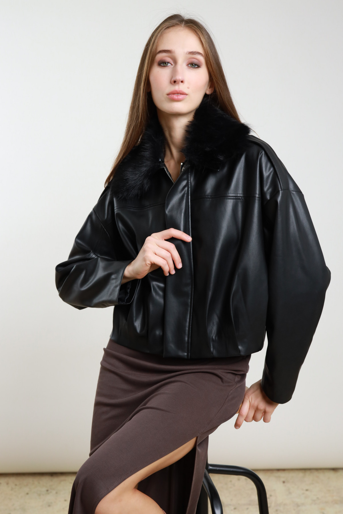 Bomber in Ecopelle con Collo in Ecopelliccia Rimovibile.