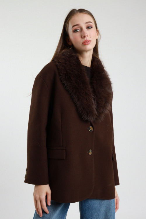 Giacca Over Collo in Ecopelliccia con Chiusura Doppi Bottoni. Tasche Frontali a Filetto con Pattina.