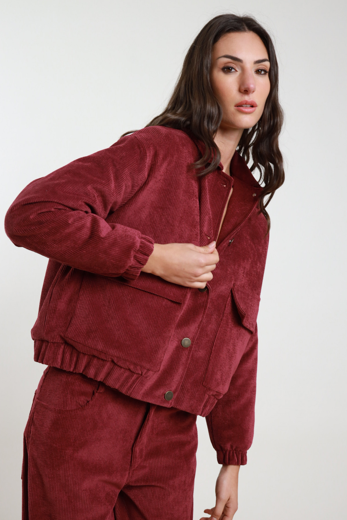 Bomber in Velluto con Chiusura a Bottoni, Colletto e Due Tasche Fronti Grandi.