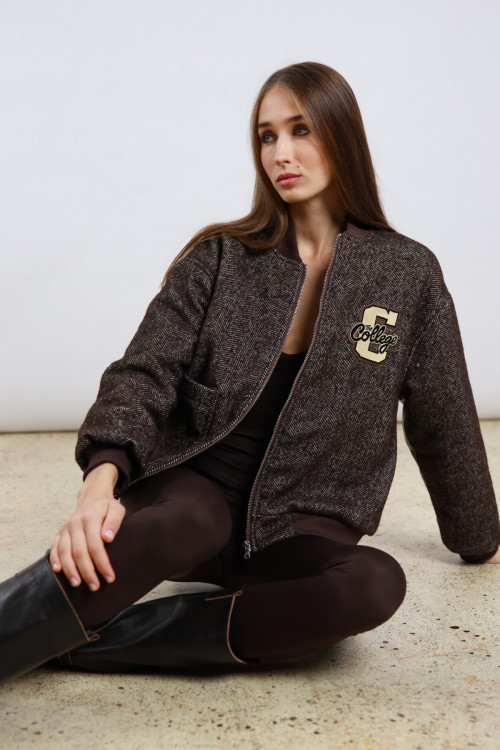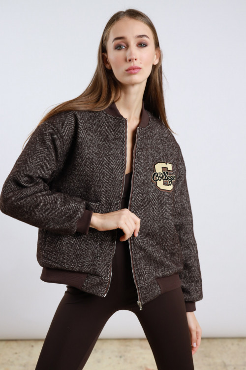 Bomber Smanicato a Quadri con Chiusura a Zip e Applicazione Spilla.