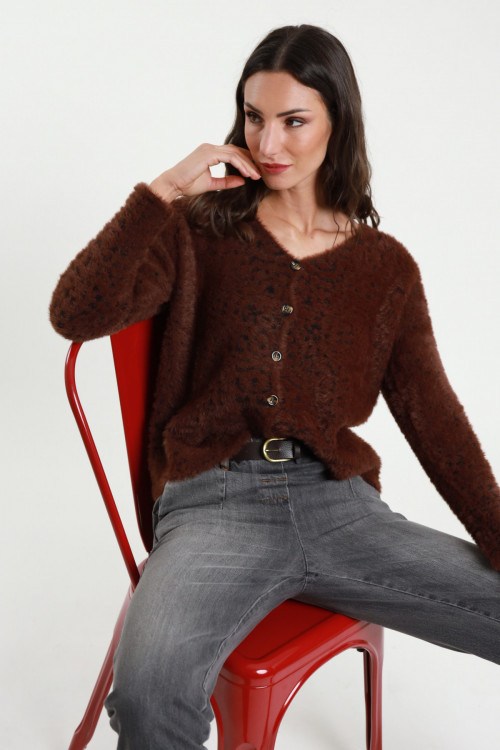 Cardigan Maculato Effetto Peloso con Chiusura a Bottoni.