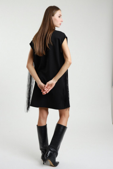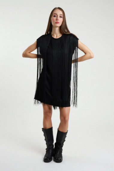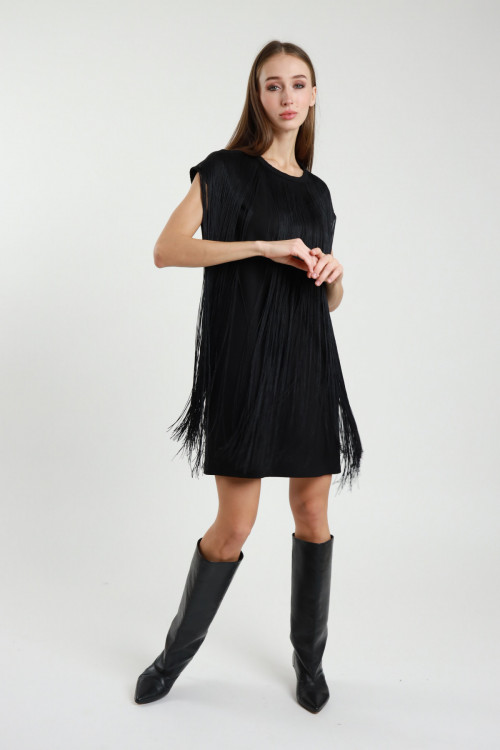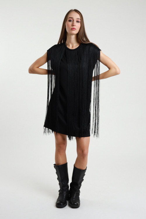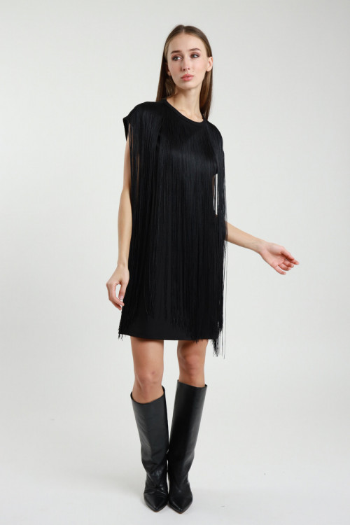 Mini Abito Tubino Mezze Maniche con Frange sul Davanti.